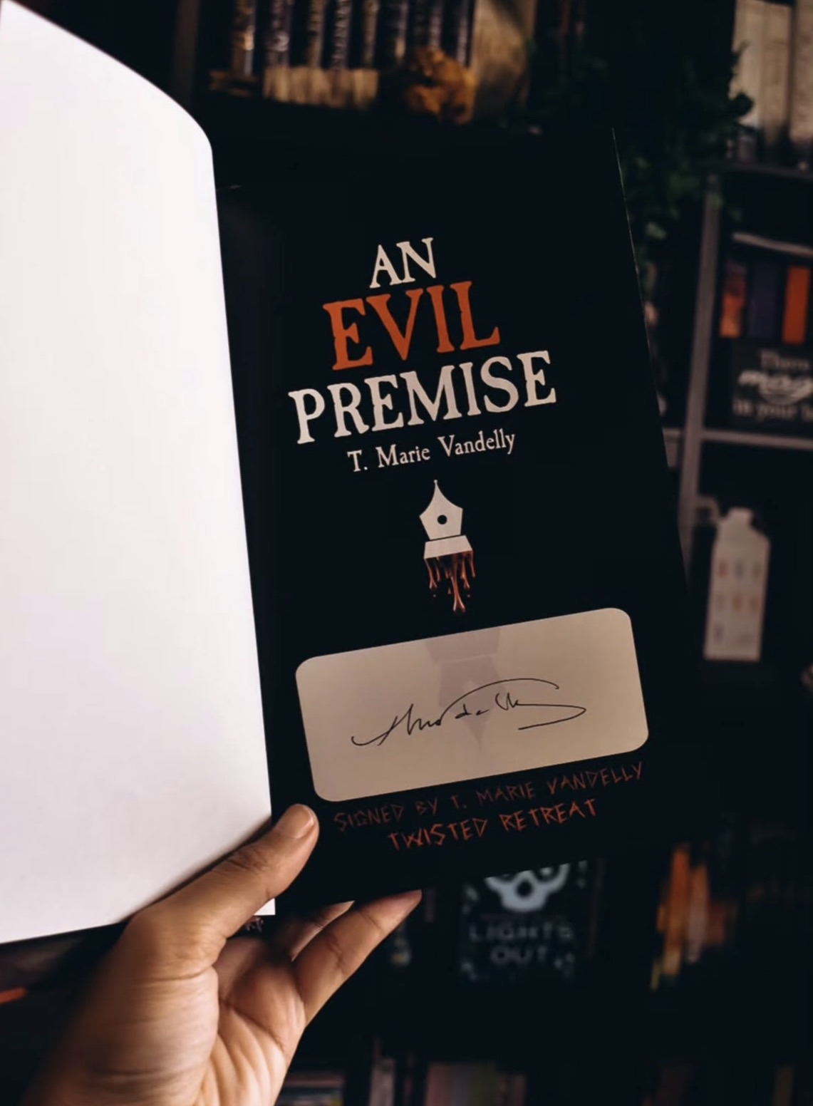 Exclusive edition of An Evil Premise by T Marie Vandelly as featured in our September 2025 boxes. Cover features two-tone foiling by @thecoversdesigner, hardcover with gloss by @alworkk, exclusive illustrated endpages by @benediktus_budi, stenciled edges by @veronicalexgm, a ribbon bookmark, and it is signed by the author!